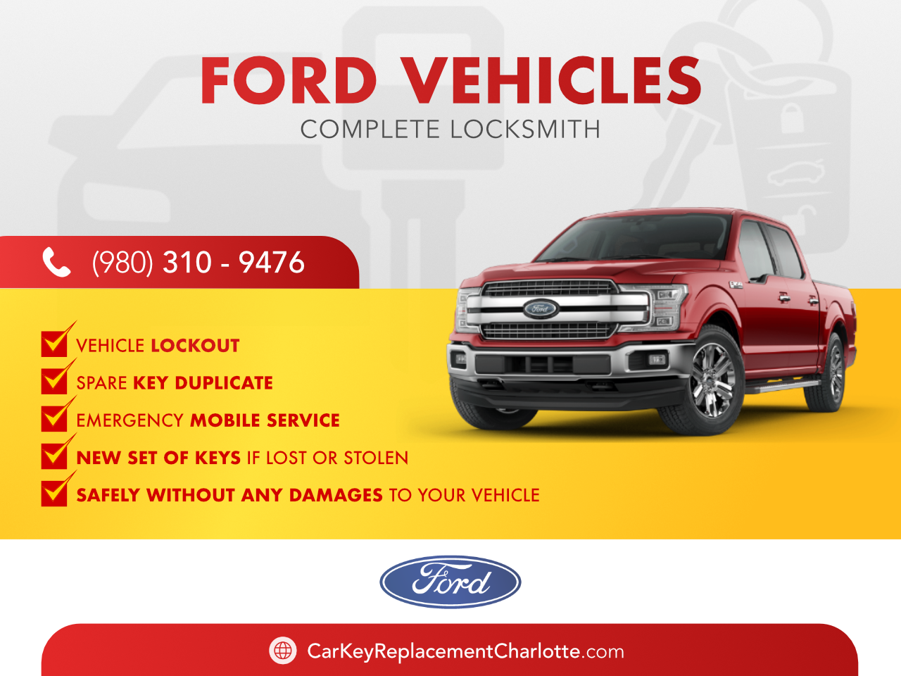 Yes of course. Our Car Key Replacement Charlotte emergency mobile locksmith service can help you unlocking your Ford vehicle and create a complete new set of keys to your vehicle.