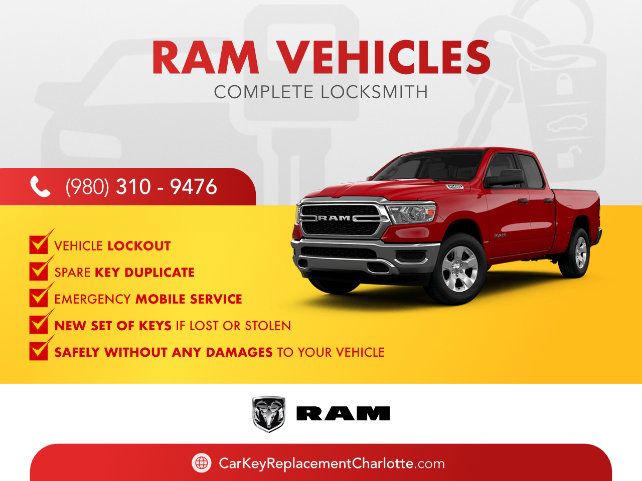 Yes of course. Our Car Key Replacement Charlotte emergency mobile locksmith service can help you unlocking your RAM vehicle and create a complete new set of keys to your vehicle.
